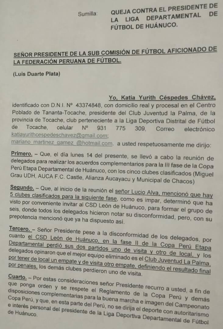 La solicitud también denuncia maltrato y desconsideración por parte del presidente de la Liga Departamental de Huánuco, el abogado Lucio Alva Ochoa. Un caso reciente ha encendido la indignación local: en la etapa departamental 2025, fase II, el club tocachino Juventud La Palma obtuvo 2 puntos y le correspondía avanzar a la siguiente fase, pero el presidente decidió darle el pase al club León de Huánuco, que sumó 0 puntos y perdió sus partidos de ida y vuelta. Para los dirigentes, este acto evidencia el autoritarismo y el manejo arbitrario del sistema deportivo en esa región.