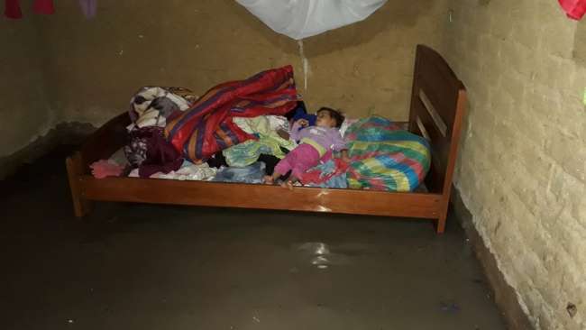 Un niño de un año de nacido durmió sobre una cama húmeda, luego que la vivienda de sus padres fue inundada ayer por la mañana por las aguas pluviales tras la torrencial lluvia que cayó por varias horas en casi toda la región San Martín. La falta de cunetas en el pasaje Simón Bolívar en el sector Brisas del Cumbaza fue la causa para que esa casa se ve afectada.