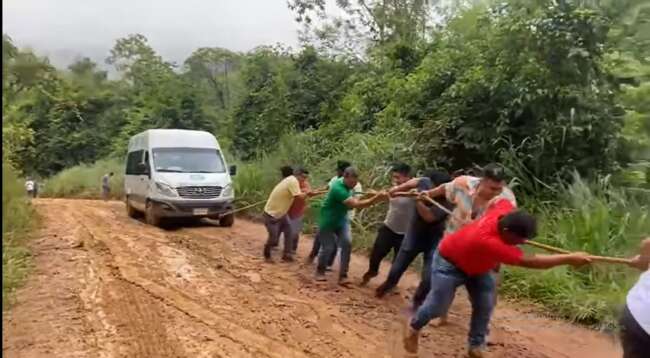 Texto de Imagen: Pasajeros ayudan a jalar el vehículo con una soga