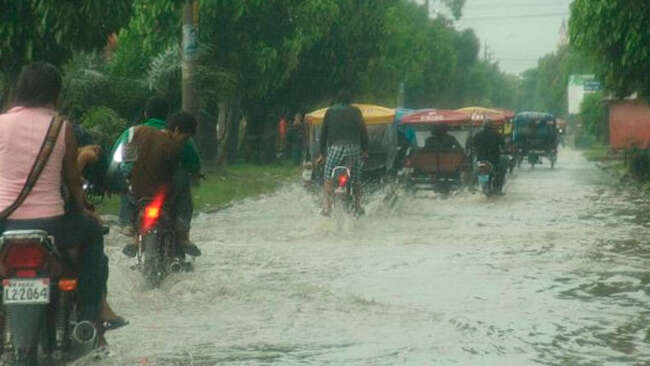 Calles se volvieron quebradas y ríos, como la intersección del Jirón Perú y Manuela Morey terminó cubierta por el agua de lluvia, los conductores de vehículos menores se vieron obligados a detenerse para evitar cualquier situación de riesgo
