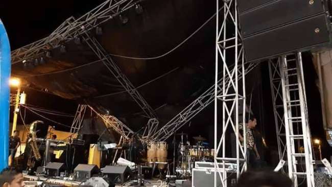 A tan solo 10 minutos de iniciado el evento bailable, fueron sorprendidos por una fuerte precipitación pluvial, acompañada de ráfagas de viento y relámpagos hizo que la gente corra a ponerse a buen recaudo, sin embargo, lo que les generó zozobra es que delante de ellos se vino abajo el escenario y las torres de sonido. Hasta el momento no se reportó personas heridas.