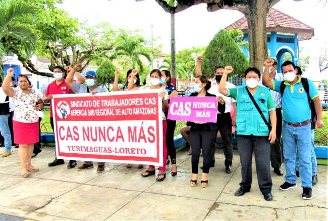 Más de 100 servidores públicos de diversas instituciones del Estado dependientes del Pliego Regional, hicieron ayer un plantón en la Plaza Mayor de Yurimaguas, como medida de presión para que el Gobierno Nacional proceda a reglamentar la Ley 31131 que elimina el régimen de Contratación Administrativa de Servicios, más conocida como CAS, aprobada por insistencia por el Congreso de la República, el pasado 4 de marzo. La Ley elimina en forma progresiva el régimen CAS que incorpora a los trabajadores del Estado a los regímenes laborales de los decretos legislativos 728 y 276.