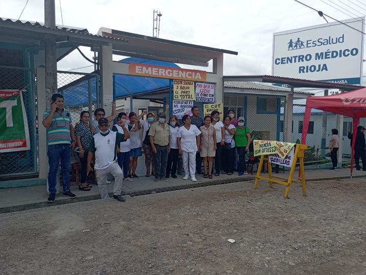 Los trabajadores del Centro Médico de Essalud en la ciudad de Rioja, acatan paro de 24 horas, que se realiza a nivel nacional en rechazo a la unificación del sistema en salud, perjudicaría directamente en el presupuesto del Seguro Social de Salud.