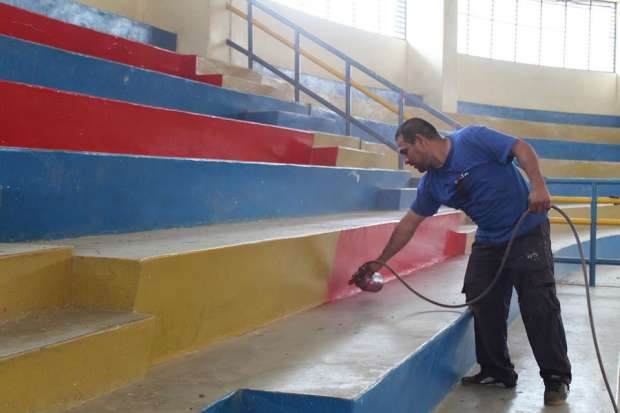 Los trabajos del día de hoy sábado consisten en condicionamiento de la mesa de control, camerinos, baños, áreas verdes, pintado de tribunas y colocación de las nuevas butacas.