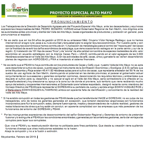 Moyobamba. Los Trabajadores de la Dirección de Desarrollo Agropecuario del Proyecto Especial Alto Mayo – PEAM, a través de un pronunciamiento público, calificaron de desacertadas y equívocas, las expresiones del Gobernador Regional Pedro Bogarín Vargas, respecto al débil trabajo y nulo apoyo al agro desde este Proyecto Especial, indicando que no es cierto que en los últimos 4 años de gestión de su antecesor Víctor Noriega Reátegui no hayan intervenido en el agro rural, pese a su nula voluntad y terquedad para no asignar recursos económicos.