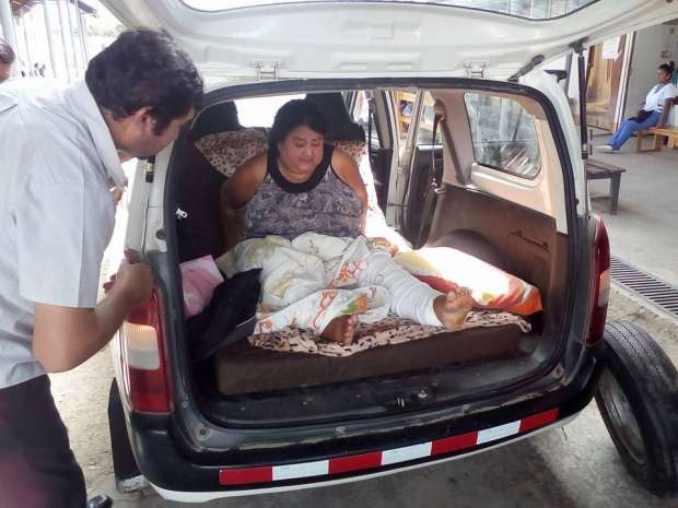 Moyobamba. Sin guardar las mínimas condiciones de los protocolos de seguridad que requiere un paciente y sin el mínimo respeto por la salud y la vida en estas condiciones trasladan a mujer enferma, así se pudo constatar cuando esta paciente fue es trasladada en una camioneta Stion Vagon al encontrarse la ambulancia malograda del Hospital de Contingencia.
