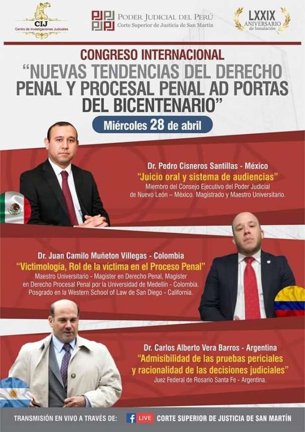 Las nuevas tendencias del derecho penal y procesal penal serán explicadas por expertos de México, Colombia, Argentina, España y Perú en el Congreso Internacional a realizarse de manera virtual, mañana miércoles 28, jueves 29 y viernes 30 de abril, en el marco del 79 Aniversario de Instalación de la Corte Superior de Justicia de San Martín.