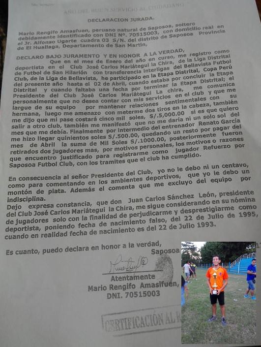 En este documento, Mario Rengifo declara bajo juramento en honor a la verdad, lo siguiente: “Que en el mes de enero del año en curso, me registré como deportista en el Club José Carlos Mariátegui La Chira de la Liga Distrital de San Hilarión con transferencia interligas de Bellavista Fútbol Club de la Liga de Fútbol de Bellavista, he participado en la etapa distrital, Copa Perú del presente año hasta el 02 de abril cuando estaba por concluir la etapa distrital, el presidente del Club José Carlos Mariátegui La Chira, me comunica personalmente que no desea contar con mis servicios en el Club y que me largue de su equipo por mantener relaciones sentimentales con su hermana, luego me amenazó con meterme dos tiros en la cabeza, también me dijo que mi pase costará cinco mil soles S/. 5 000.00 si es que quiero salir a otro club”.