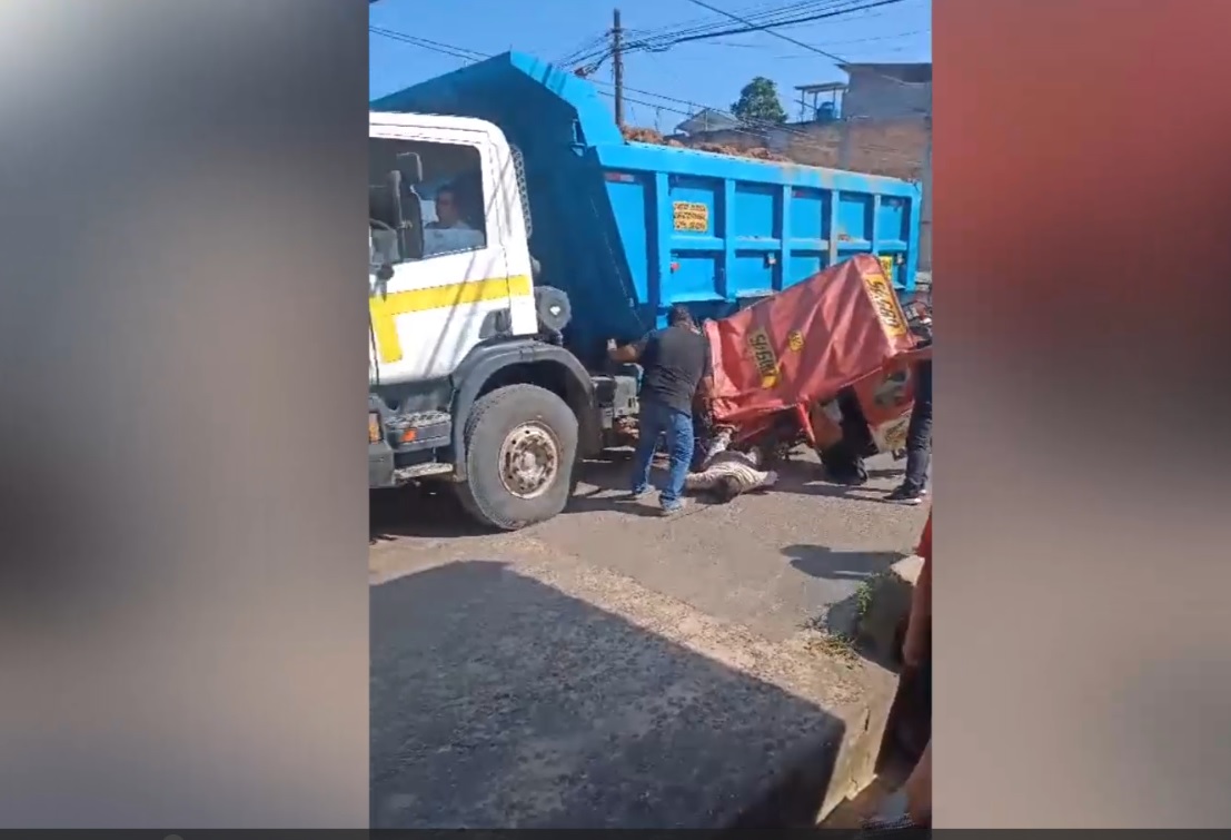 En un accidente ocurrido ayer por la mañana en la intersección de los jirones Alfonso Ugarte y Simón Bolívar del distrito de Morales, un trimóvil quedó atrapado debajo de un camión volquete después de una fuerte colisión, dejando a su conductor y pasajero gravemente heridos de consideración.