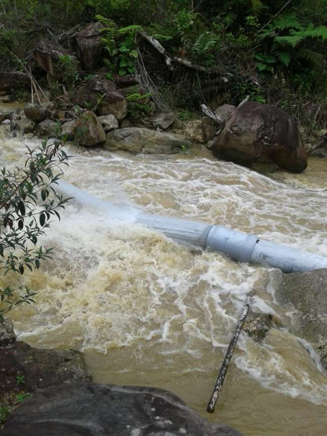 Moyobamba. Personal técnico de la EPS Moyobamba, están evaluando permanentemente la problemática que viene presentándose en el sector de Juninguillo, ante la intensa lluvia que incremento el caudal de las aguas en la quebrada, poniendo en riesgo el cruce de la tubería matriz de doce pulgadas y a la fecha viene provocando el desabasteciendo de agua potable al sector de Zaragoza lo que dificulta el normal servicio.