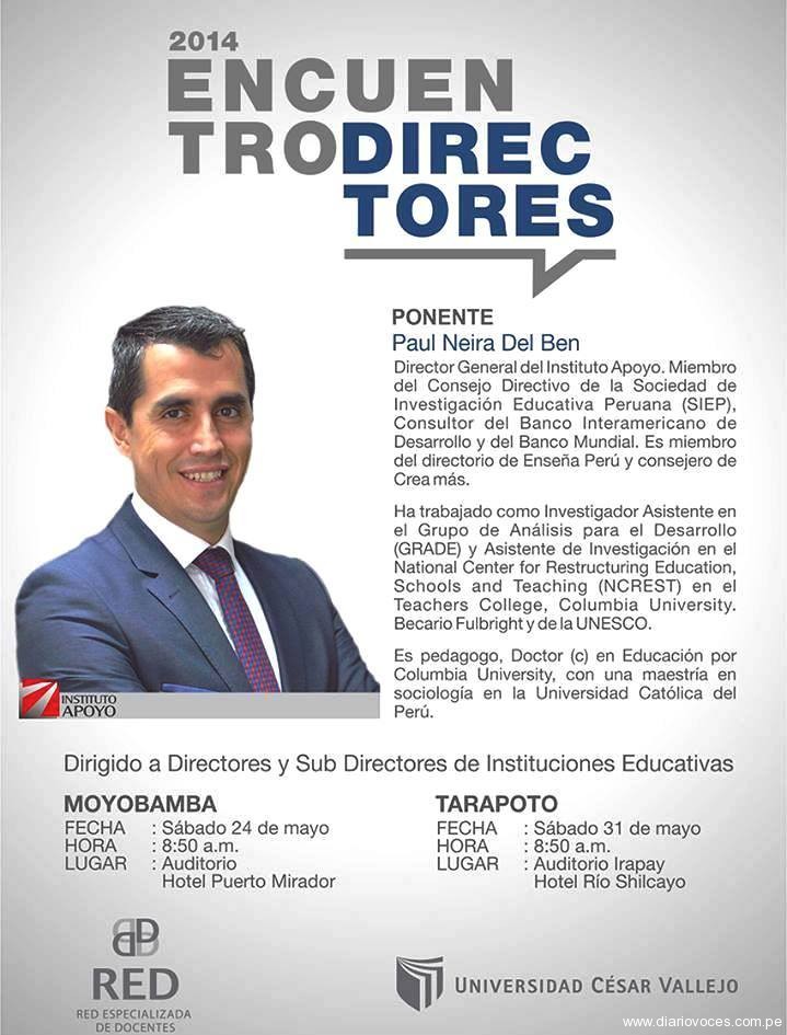 Tarapoto. La Universidad César Vallejo, en el marco de su compromiso con la educación en la región y por encargo especial de su fundador, Dr. César Acuña Peralta y de su directora general MBA María Armas Zavaleta, organiza el 3° Encuentro de Directores 2014, dirigido a los gestores líderes de las instituciones educativas de la región San Martín y la provincia de Alto Amazonas, con la participación del Dr. Paul Neira Del Ben, quien es el director general del Instituto Apoyo de la ciudad de Lima y miembro del Consejo Nacional de Educación para el ejercicio 2014-2020, asimismo, es consultor del Banco Interamericano de Desarrollo y del Banco Mundial.