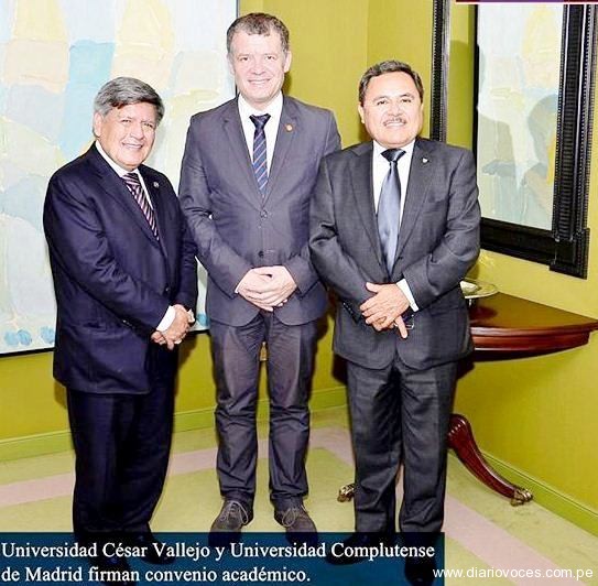 En el Salón de Actos del rectorado de la Universidad Complutense de Madrid (UCM) se reunieron para ultimar detalles, el Ing. César Acuña Peralta, fundador de la Universidad César Vallejo (UCV), el Dr. Juan Manuel Pacheco, gerente general de la UCV y el Dr. Andrés Arias Astray, vicerrector de Relaciones Institucionales y Relaciones Internacionales de la Universidad Complutense de Madrid.