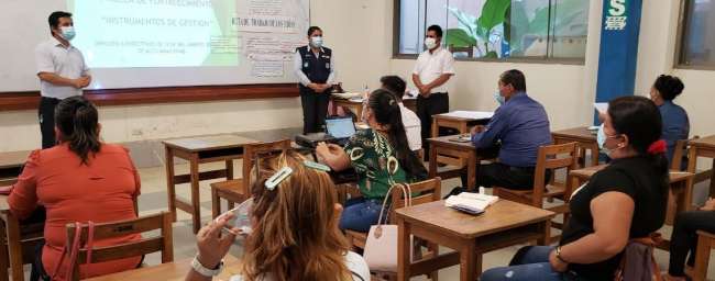 Cumpliendo los protocolos de bioseguridad se acondicionaron varias aulas donde los especialistas trabajan con los directores socializando primero las normas para luego orientar los modelos de elaboración de los instrumentos de gestión.