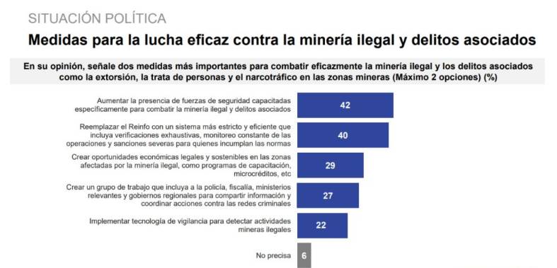 Finalmente, la encuesta señala que la principal medida para enfrentarlo es la mayor presencia de las fuerzas del orden en las zonas donde se practica, al igual que reemplazar el Reinfo por un sistema más estricto, con un monitoreo constante y sanciones severas a quienes realizan esta ilegal actividad.