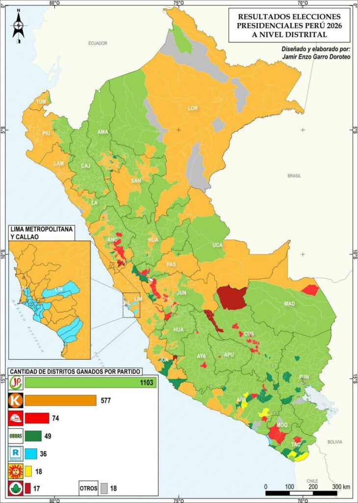 El mapa de resultados de las elecciones presidenciales del Perú 2026 a nivel distrital no deja lugar a mayores sorpresas, pero sí confirma tendencias profundas que el país arrastra desde hace décadas. La distribución territorial del voto muestra un patrón reconocible: un país dividido, con un norte y sur fragmentados, y una geografía política que responde más a identidades históricas y percepciones de exclusión que a propuestas programáticas. En ese escenario, la irrupción de Roberto Sánchez logra capitalizar una demanda latente en amplios sectores del electorado que, sin replicar exactamente el fenómeno de Pedro Castillo, evidencia que una parte significativa del país buscaba nuevamente una figura que encarne ruptura con el statu quo.