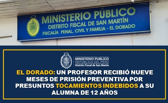 La Fiscalía Provincial de El Dorado obtuvo nueve meses de prisión preventiva contra un docente identificado con el nombre de Vidauro Sánchez Vásquez, quien es investigado por el delito de tocamientos indebidos a su alumna de doce años, ocurrido en el distrito de San José de Sisa, región San Martín.