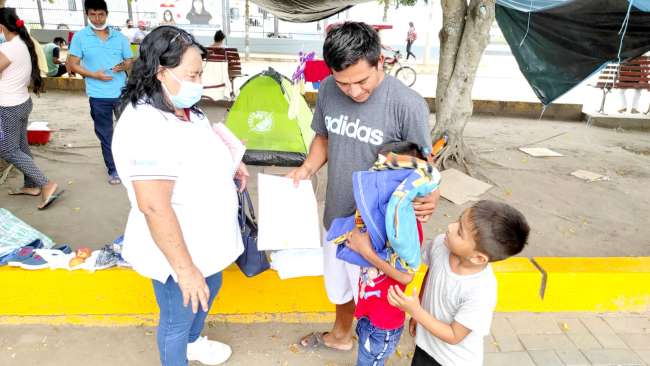 Tras conocer el caso, las integrantes de la asociación de damas Manos Unidas de inmediato les llevaron víveres, ropa, frazadas y 140 soles en efectivo, para que puedan alquilar una habitación y pernoctar para evitar que les afecte la lluvia. Cualquier apoyo para ellos los pueden ubicar en la única carpa de color verde frente al Hospital II – 2 de Tarapoto. (Karina Roncal)