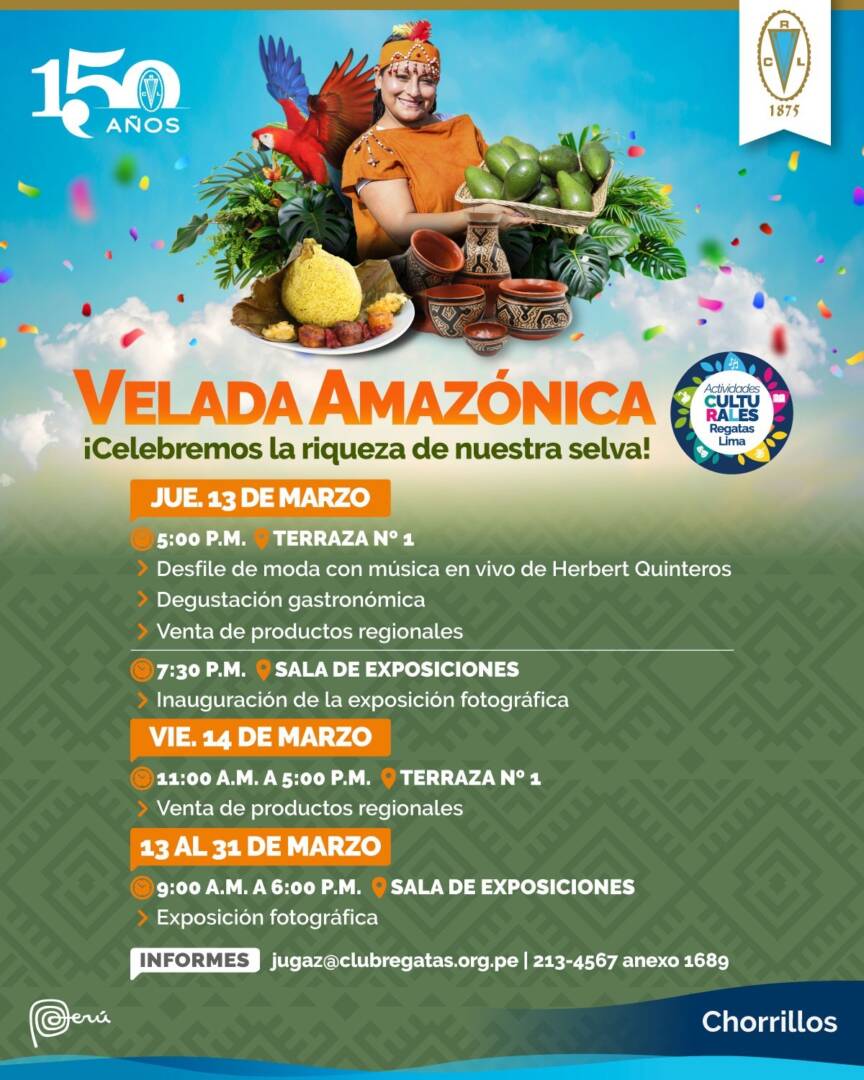 Con el respaldo de la Dirección de Cultura del Club Regatas Lima, la Cámara de Comercio de San Martín y el Consejo Amazónico de Cámaras de Comercio, se llevará a cabo la Velada Amazónica, un evento de promoción cultural que promete ser una experiencia inolvidable.