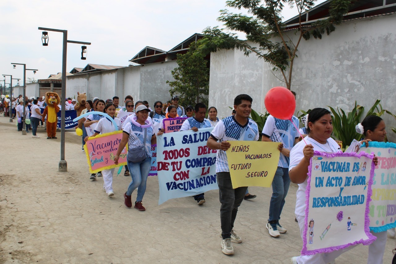 Previo a la jornada, el personal de la UNGET realizó un multitudinario pasacalle de sensibilización, con pancartas y mensajes sobre la importancia de la vacunación, en coordinación con la Municipalidad Provincial de Mariscal Cáceres.