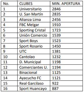 Luego de jugarse gran parte de la 12da. fecha del Torneo Apertura -resta un partido-, nueve clubes (‘U’, San Martín, Alianza, Melgar, Cristal, Boys, Sport Rosario y UTC) ya cumplieron con la segunda parte de la Bolsa de Minutos (acumular 1350 minutos).