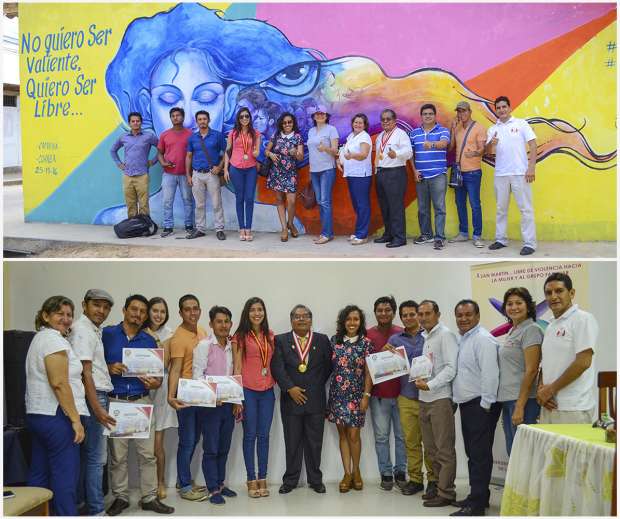Con la finalidad de dar a conocer el esfuerzo desplegado de artistas plásticos de San Martín durante la campaña CONTRA LA VIOLENCIA DE GÉNERO, organizado por la mesa de Concertación Multisectorial Contra la Violencia de Género (MCMVG) en coordinación con el Ministerio de la Mujer y Poblaciones Vulnerables y la Subprefectura de la Provincia de San Martín, se realizó el martes 20 de diciembre en los ambientes del auditorio del local central de la Universidad Nacional de San Martín la entrega de merecidos reconocimientos a 9 jóvenes artistas que colaboraron en la creación de hermosos y reflexivos murales pictóricos en la ciudad de Tarapoto, con el objetivo de concientizar a la población sanmartinense en relación a la no violencia contra la mujer y al grupo familiar. Dentro de este acto protocolar estuvo presente en calidad de invitado el vicerrector académico de la Universidad Nacional de San Martín, Dr. Oscar Wilfredo Mendieta Taboada, quien manifestó que la Universidad no puede estar ajena a los problemas de violencia de género, ya que somos una institución de ciencia y cultura, que busca prevalecer los derechos humanos y la igualdad de oportunidades dentro la comunidad universitaria. Asimismo felicitó a los artistas presentes, ya que con su arte contribuyen a la solución de la violencia de género en nuestra sociedad. Cabe mencionar que la campaña CONTRA LA VIOLENCIA DE GÉNERO tuvo lugar en el mes de noviembre del presente año, realizando actividades y eventos de sensibilización social, dentro de los cuales se consideró el valioso trabajo de los jóvenes artistas de nuestra región, con motivo de celebrarse el 25 de noviembre el Día Internacional contra la Violencia de Género.
