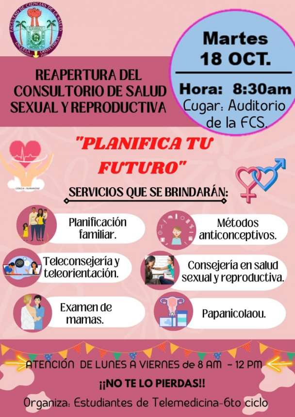 Los servicios que ofrecerán: Planificación Familiar – Métodos Anticonceptivos- Teleconsejeria y teleorientación – Consejería en Salud sexual y reproductiva – Examen de Papanicolau – Examen de mamas – Atención de lunes a viernes de 8 a 12 de la mañana. Los responsables de la atención y orientación son los Estudiantes de 6to. Ciclo de la Universidad.