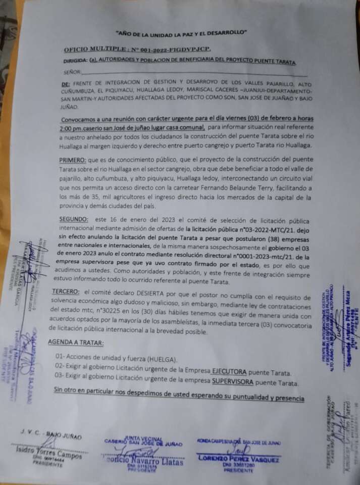 Según el oficio 001-2022-FIGDVPJCP, de fecha 29 de enero de 2023, los dirigentes del Frente de Integración y Desarrollo de los Valles Pajarillo, Alto Cuñumbuza, Piquiyacu, Huallaga-Ledoy, San José de Juñao, Bajo Juñao y Juanjuí, están convocando a una reunión de carácter de urgencia para el día viernes tres enero 2023, para que se informe sobre la situación real del proyecto Puente Tarata.