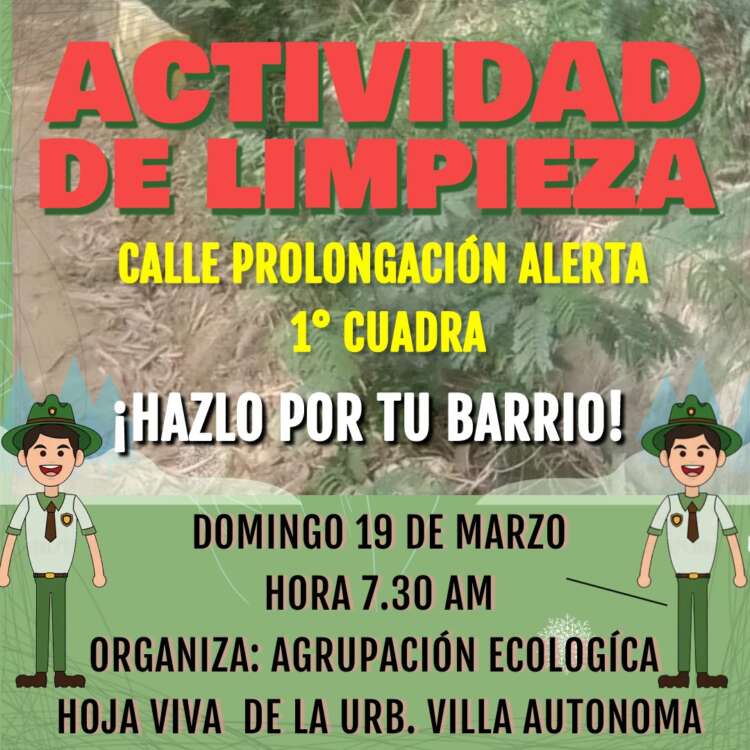 Con el afán de darle una mejor ornamentación a la calle del jirón Prolongación Alerta y a los ojos de agua del Fondero y del Achual, en Tarapoto, la agrupación ecológica Hoja Viva, en coordinación con el comité de Villa Autónoma, están organizando la primera jornada de limpieza que busca también sembrar cultura de conservación y hábitos de mantenimiento de zonas ecoturísticas que se hallan muy cerca al centro de la ciudad.