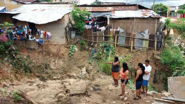 A punto de colpsar se encuentran varias viviendas ubicadas cerca de la quebrada Amorarca, entre el límite de Tarapoto y Morales, según los vecinos el problema se inició luego que responsables del encausamiento ingresaron a la zona con maquinaria pesada y no volvieron para continuar con la obra dejando inestable los bordes.