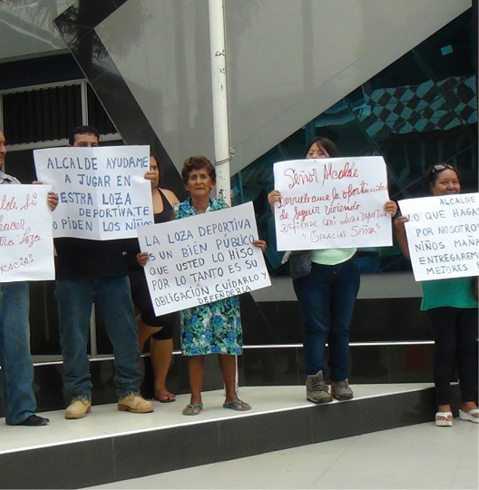 Durante casi una hora los vecinos del sector Belaúnde liderados por Víctor Reátegui Ruelas protestaron con carteles en mano, exigiendo documentos que indiquen que la losa deportiva es un bien público que estaba al cuidado de los vecinos durante 34 años y fueron ellos quienes invirtieron su dinero para mantenerlo y ponerlo al servicio de la población.