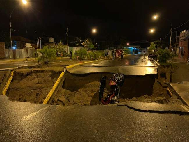 Ayer a las dos de la mañana durante la torrencial lluvia que soportó la región San Martín, se hundió parte de la cuadra uno de la Vía de Evitamiento de Tarapoto, debido a una filtración de agua por un costado de la alcantarilla que fue construida en la quebrada Amorarca, situación que fue minando parte de esa infraestructura. A consecuencia de este hecho tres personas resultaron heridas, tras la caída de un trimóvil en esa zanja.