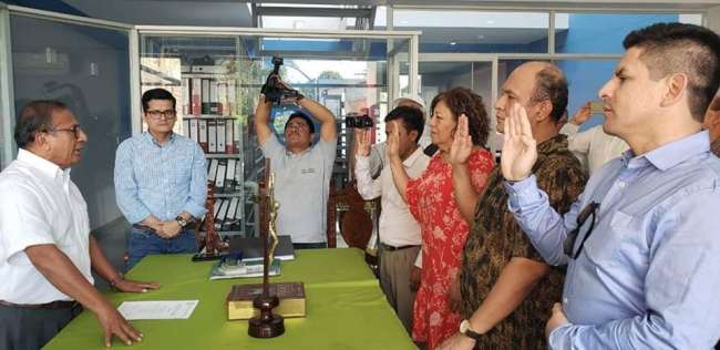 15 notarios de los 23 que existen se presentaron al proceso, luego de reunirse para evaluar el caso determinaron continuar con la lección del nuevo decano y por mayoría ganó la lista de Coral Pérez, quien de inmediato procedió a juramentar al cargo junto con los integrantes de su directiva. (Hugo Anteparra – Foto: Glenda Mello)