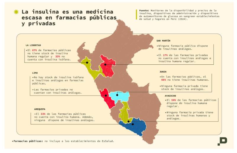 Las investigadoras Janeth Tenorio y Karen Bonilla, estudiaron los obstáculos para el acceso a la insulina y los dispositivos de uso en 2018. En su reporte de este año compararon datos de los stocks de insulina solicitados a 17 farmacias públicas y 18 privadas de Lima, La Libertad, Arequipa, San Martín, Junín y Ayacucho. Así encontraron que el 35% de farmacias públicas carece de reservas de insulina humana regular y ninguna dispone de insulinas análogas. Esto obliga al 21% de pacientes a tener que buscar su medicamento hasta en cinco farmacias.