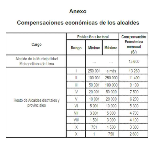 De acuerdo a una ley aprobada durante el Gobierno del fallecido expresidente Alan García, se estableció que la remuneración de los alcaldes se fija en relación a la población electoral de las provincias y distritos que los eligieron.