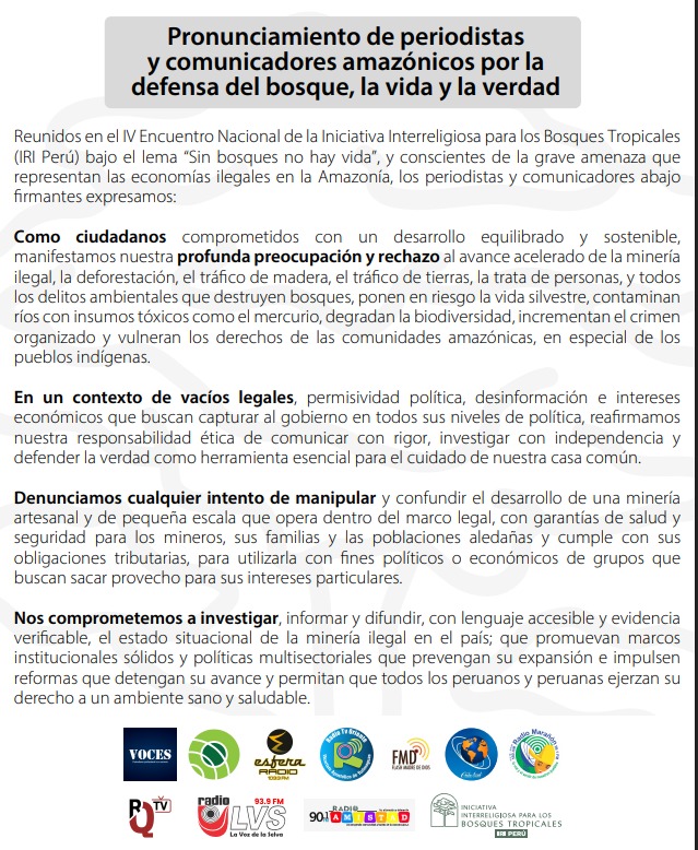 El documento lleva la firma de reconocidos medios de comunicación regionales, entre ellos: Diario Regional VOCES (San Martín), Radio La Voz de Selva (Iquitos, Loreto), Radio Oriente (Yurimaguas, Loreto), Esfera Radio (Chachapoyas, Amazonas), Flash Madre de Dios Noticias (Puerto Maldonado), Radio Madre de Dios (Puerto Maldonado), Asociación Radio Amistad (Aucayacu, Huánuco), Radio Onda Azul (Puno), Radio Quillabamba (Cusco) y Radio Marañón (Jaén, Cajamarca), así como instituciones aliadas como la Iniciativa Interreligiosa para los Bosques Tropicales – IRI Perú.