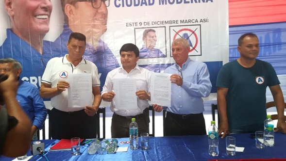 Moyobamba. Como parte de sus actividades proselitistas, el candidato al Gobierno Regional de San Martín, Walter Grundel Jiménez, ayer miércoles realizó una conferencia de prensa en la ciudad de Moyobamba, donde junto a los excandidatos a la alcaldía provincial, Filiberto Mego Rodríguez (Acción Popular), Michael Aguilar Santa Cruz (Vamos Perú) y Anastacio Silva Vásquez de APP, suscribió un pacto de respeto y compromiso con la ciudad capital regional.