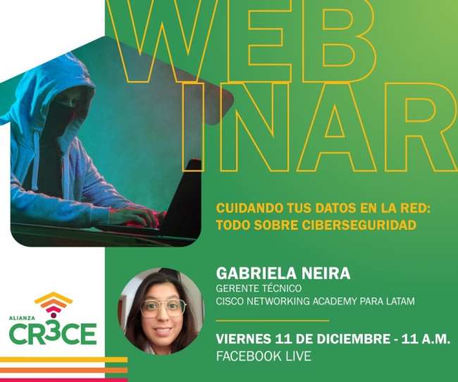 Este viernes 11 de diciembre a partir de las once de la mañana se trasmitirá el Webinar de la Alianza CR3CE Cedro, donde estará Gabriela Neira Medina, Gerente Técnico de Cisco Networking Academy para Latinoamérica, quien disertará sobre todo lo que debemos saber de la Ciberseguridad y las medidas que debemos tomar para estar seguros (a) en la Red.