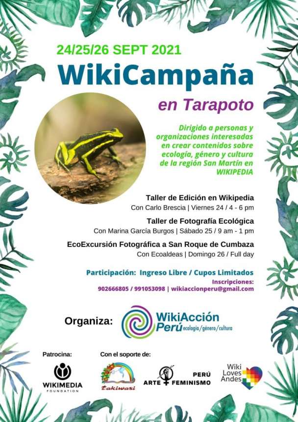 Del 24 al 26 de septiembre de 2021, WikiAcción Perú desarrollará una WikiCampaña gratuita (previa inscripción, cupos limitados) para la generación de contenidos ecológicos, de género y culturales de la región San Martín en Wikipedia, la enciclopedia libre de internet. Con ese motivo se invita a participar a todas las personas y organizaciones interesadas comunicándose a través de los Cel/Whtspp 902666805 / 991053098 o al correo electrónico [email protected].