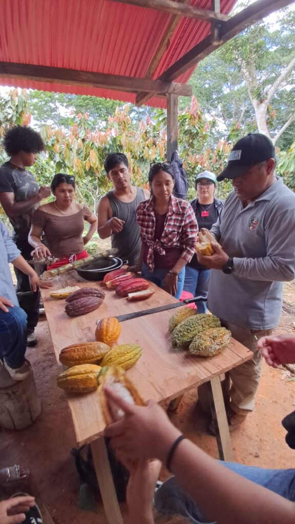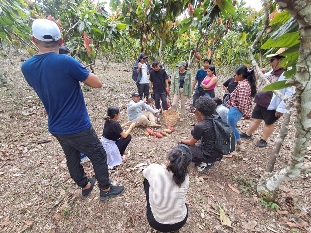 La jornada inició con un desayuno a base de cacao, donde el chocolate caliente y el pan elaborado con este fruto anunciaron el eje central de la visita. El Ing. Silva, de trato sencillo y mirada apasionada, explicó que el cacao se aprende con todos los sentidos: observando el bosque, tocando la tierra, escuchando la vida del cultivo y entendiendo su relación con el entorno natural.