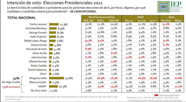 Encuesta telefónica nacional del Instituto de Estudios Peruanos (IEP). Base febrero 2021. Total, de entrevistados a nivel nacional 1220. Realizada del 19 al 23 de febrero. Margen de error de 2,8 puntos (encima y debajo) en cada resultado.